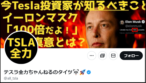 その人物とは、Tesla株に集中投資を行っているテスラ全力ちゃんねるのタイツさんというお方です。